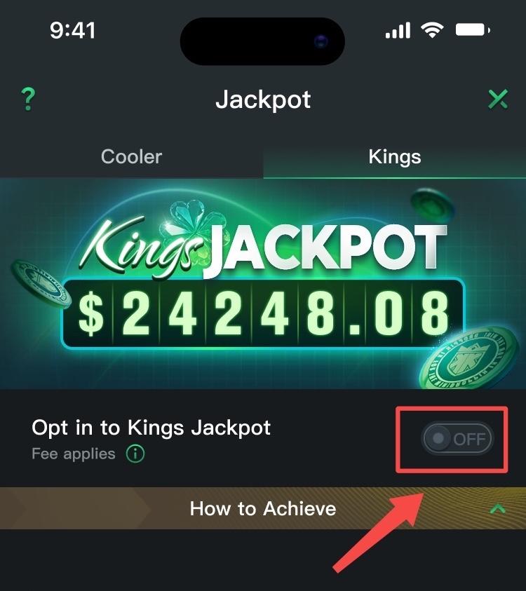 Selecione “Kings” e certifique-se de que o botão OPT IN TO KINGS JACKPOT esteja ativado (ON).
