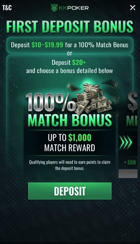 O Bônus de 100% no Primeiro Depósito está disponível para todos os novos jogadores que se registrarem no KKPoker, desde que nunca tenham feito um depósito antes pelo nosso caixa oficial. É o seu presente de boas-vindas, oferecendo um começo fantástico nas mesas de poker com dinheiro real.